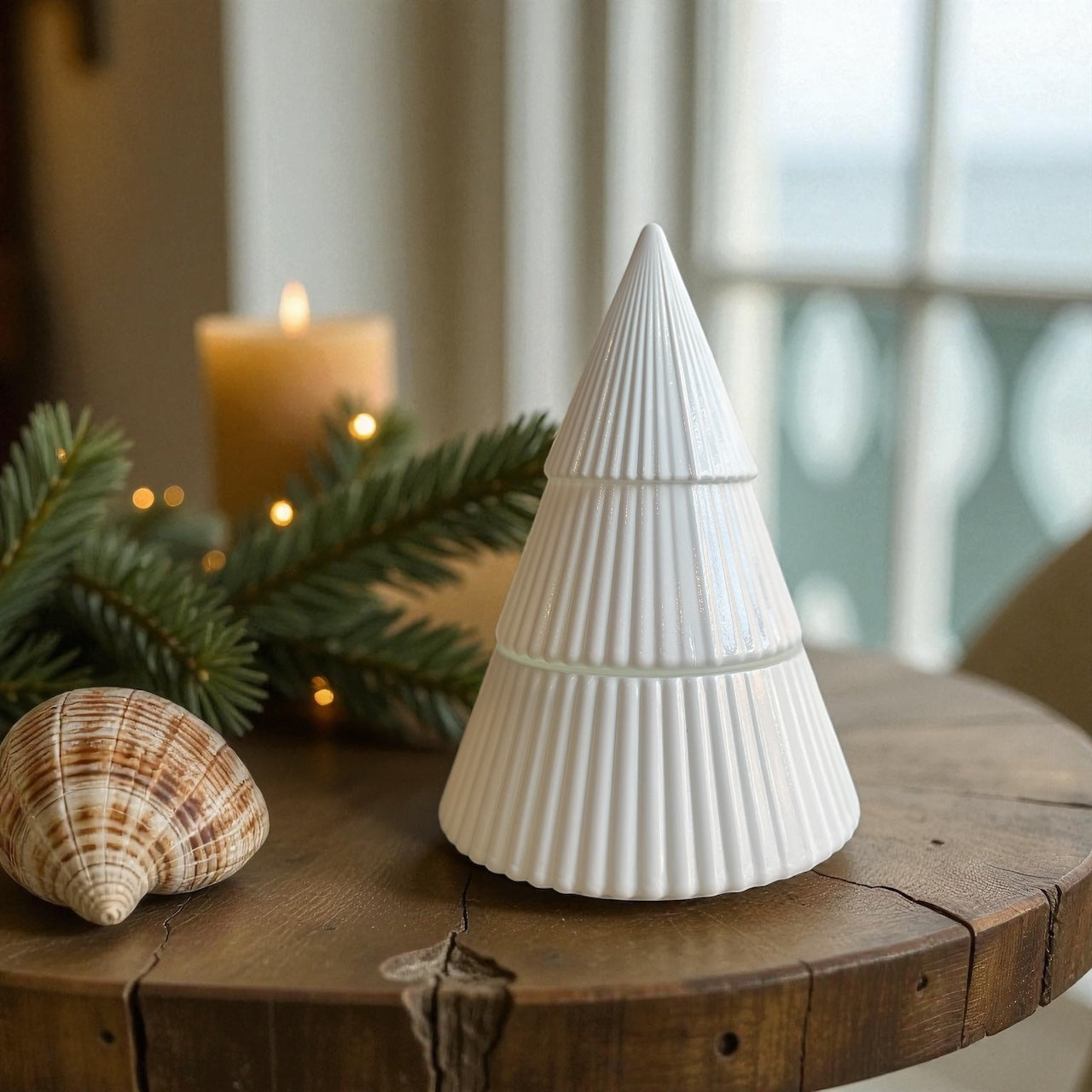 Imagine a fresh Christmas tree standing in a beach house — salty air drifting through open windows, citrusy brightness from a bowl of oranges on the counter, and a warm woody scent of driftwood.